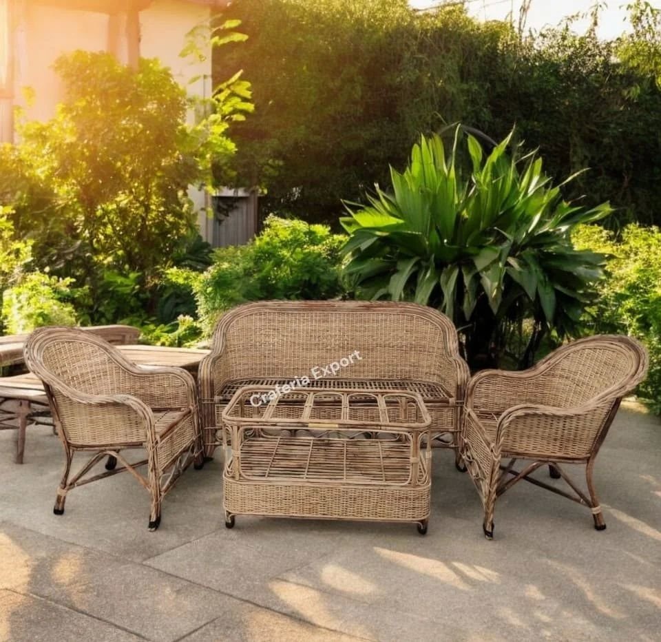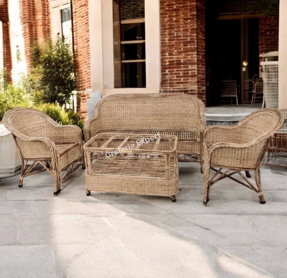 The set includes a plush sofa and a sturdy table, all made from high-quality cane materials.